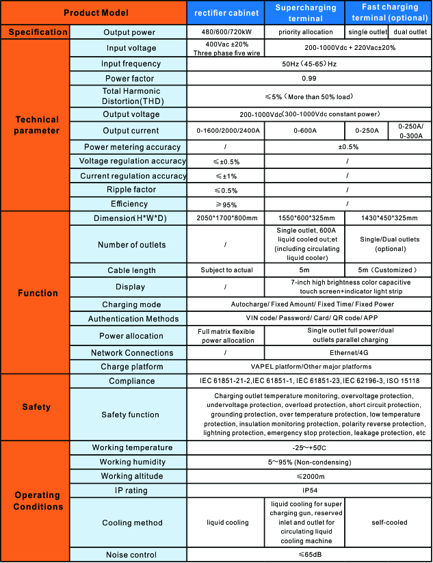 The 480/600/720kW fully liquid-cooled ultra-fast charging stack (ultra-fast charging + fast charging) is composed of a rectifier cabinet (liquid-cooled charging module), an ultra-fast charging terminal (1 600A liquid-cooled gun and its cycle), and a fast charging terminal (single gun 250A, dual guns 250A each, dual guns 300A each, freely combinable), with a total of 12 guns. highway charging stations and other occasions that require DC ultra-speed charging.