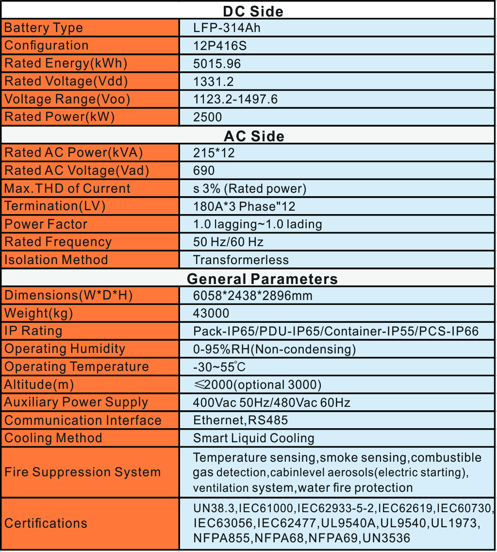 All-in-One Design: Integrated BMS, PCS, and EMS design for plug-and-play operation with visual interface support;High Safety: Cells pass stringent industry testing with UL/CE/GB certifications, featuring zoned fire protection and combustible gas detection for reliable safety;Long Lifespan: Utilizes 314Ah lithium iron phosphate cells with ≥11,000 cycle life. Precise liquid cooling temperature control significantly reduces condensation, lowers energy consumption, and extends cycle endurance;